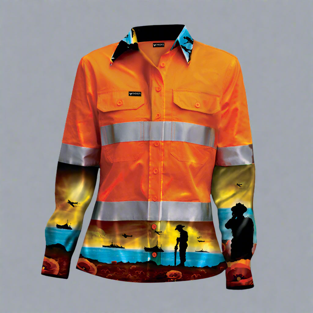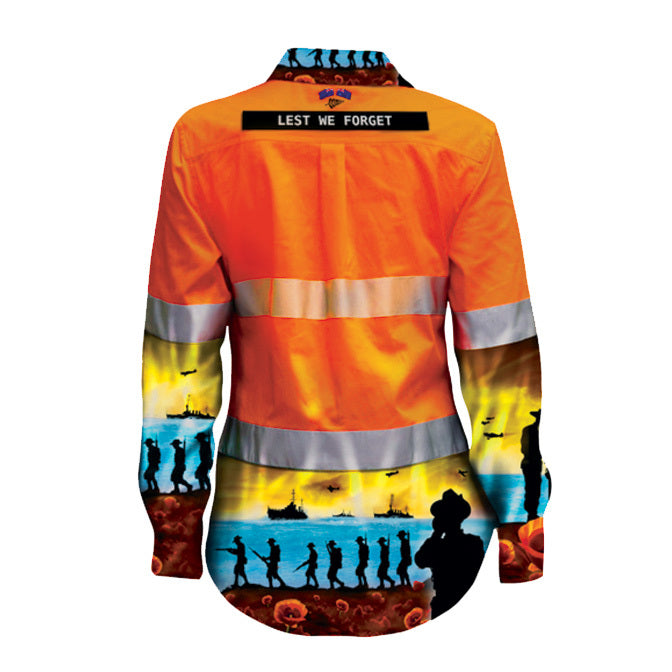 WOMEN'S LEST WE FORGET ORANGE DAY/NIGHT HI VIS HALF BUTTON WORKSHIRT